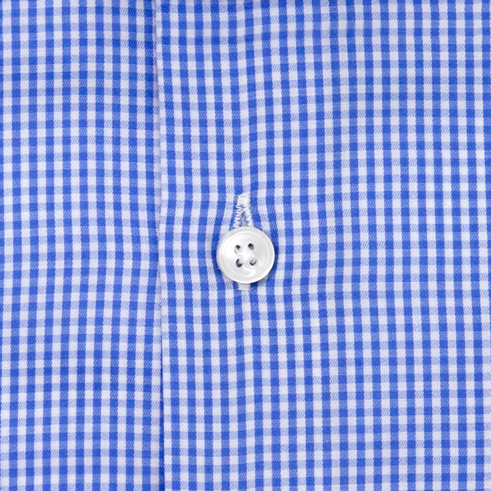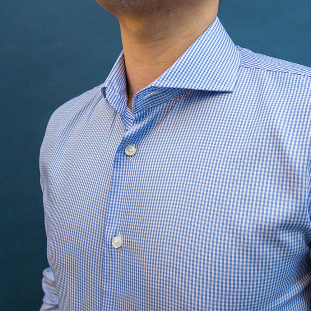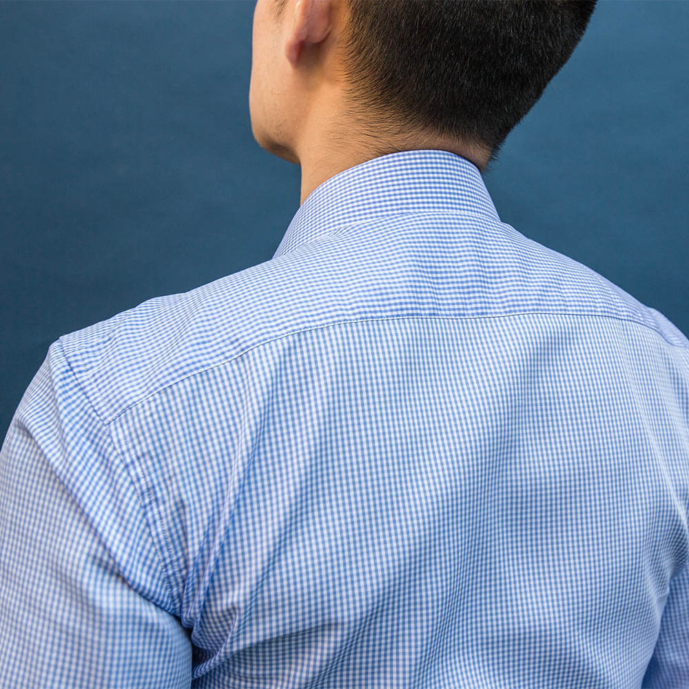 The collar adds modern edge. The sky-blue check stays office-clean with opacity: ~4/5 and wrinkle resistance: ~4/5.