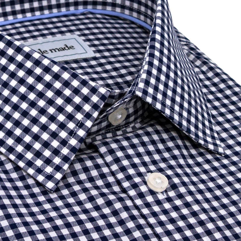 This checked navy shirt is more suitable for business professional or business casual settings given its gingham fabric pattern. Opacity: ~4/5 and wrinkle resistance: ~4/5.